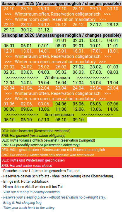 Bitte beachtet unseren Saisonplan (Bewartet / Winterraum) und für den Zustieg diese Informationen.